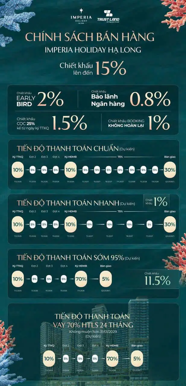 The Bayside Hạ Long (tên gọi chính thức của Imperia Holiday) hiện đang bước vào giai đoạn bùng nổ sau sự kiện động thổ cuối năm 2025. Để hỗ trợ tối đa cho khách hàng trong bối cảnh thị trường du lịch Hạ Long phục hồi mạnh mẽ, chủ đầu tư MIK Group đã công bố bộ chính sách bán hàng ưu việt, tập trung vào việc giãn tiến độ thanh toán và tối ưu hóa đòn bẩy tài chính. Đây được coi là “cơ hội vàng” để sở hữu căn hộ view vịnh sở hữu lâu dài với mức chi phí ban đầu hợp lý nhất.